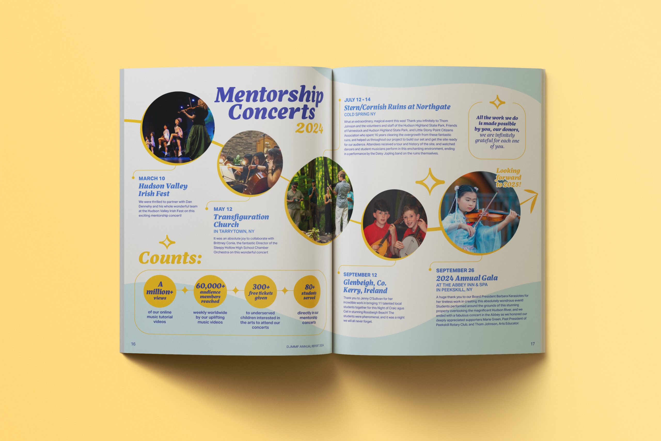 The Daisy Jopling Music Mentorship Foundation, based in Peekskill, New York, provides music education for children and teens through local and global initiatives. For its first annual report (2024), the editorial layout was designed and the visual identity was updated, defining a new color palette, graphic ornaments, and typography. The visual direction was inspired by the founder’s positive and uplifting spirit, as well as the foundation’s diverse music programs. Custom graphics were created to clearly present the organization’s achievements and impact. The report was designed for digital publication and later adapted for print.